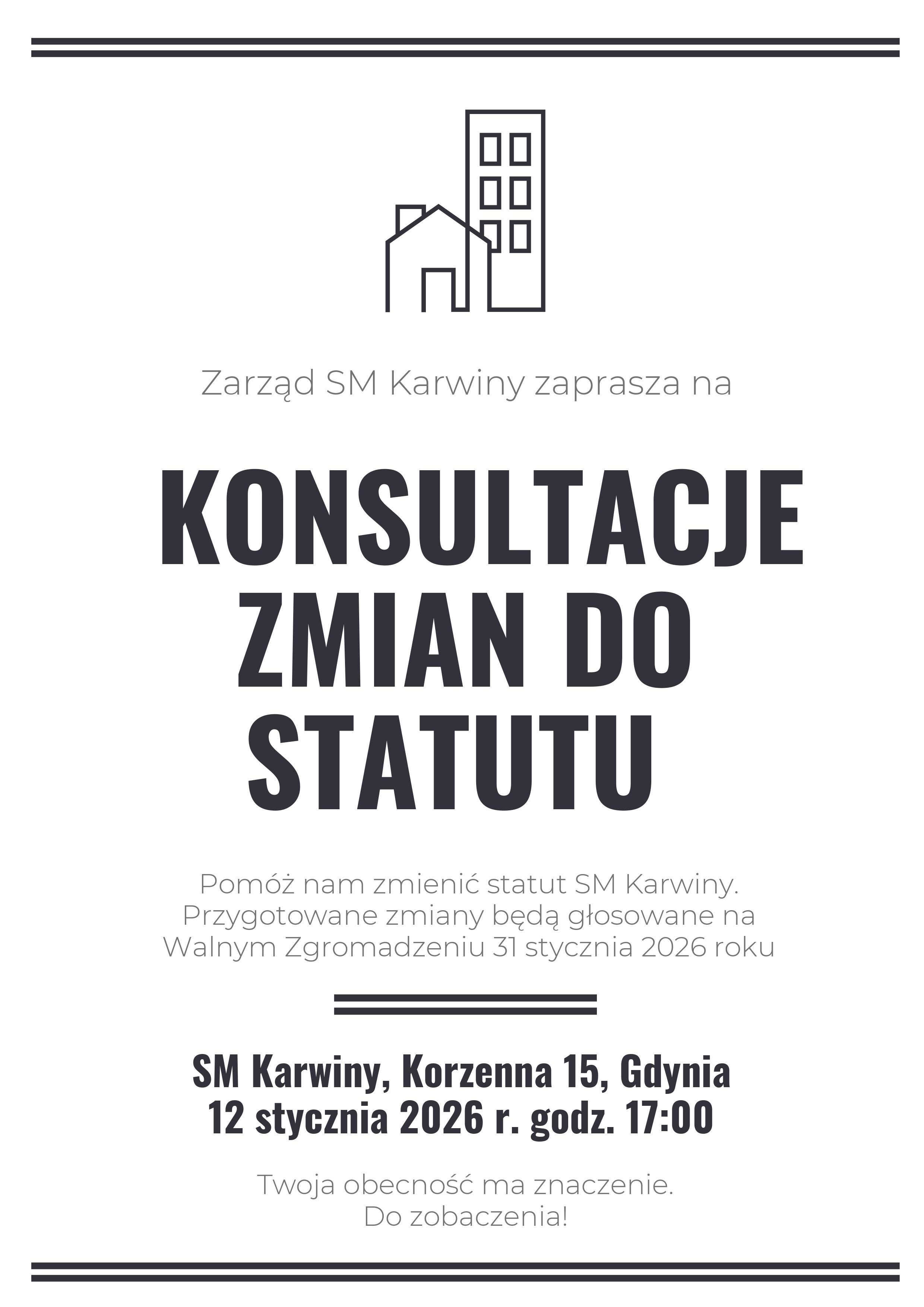 Zapraszamy na spotkanie konsultacyjne dotyczące zmian do statutu SM Karwiny. Projekty proponowanych zmian w raz z komentarzami można znaleźć na portalu Internetowej Obsługi Kontrahenta (IOK)